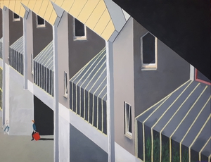 2012De kubuswoningen op de Blaak in Rotterdam waren een sensatie toen ze werden opgeleverd, nu verwaarloosd. Toen ze nieuw waren was ik heel jong en optimistisch over de toekomst, de gebouwen leken dit gevoel te bevestigen. Nu vertegenwoordigen ze vergane glorie. De stad kan een eenzame koude plek zijn, maar geeft ook de kans verloren energie terug te winnen, die energie uit de tijd waarin alles mogelijk was en energie onuitputtelijk. De rode tas was toeval en als een grap begonnen, vandaar de titel, maar later ben ik meer rode tassen gaan gebruiken als symbool voor de zware bagage die veel mensen met zich meedragen.